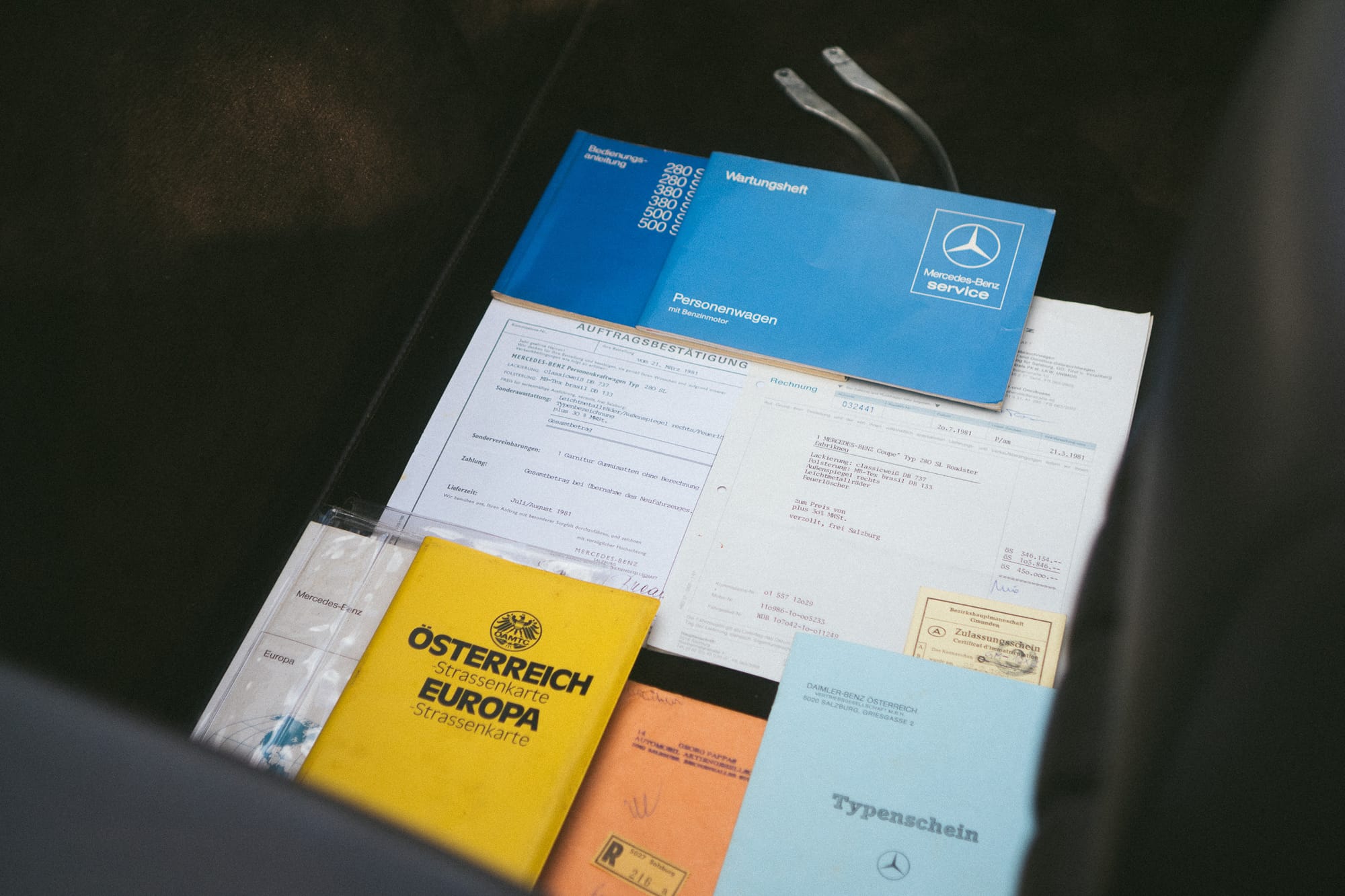 Zu diesem Mercedes-Benz 280 SL R107 liegen alle Schlüssel im Original vor. Zum originalen Zulassungsschein ausserdem noch der originale Typenschein, das originale Scheckheft, die Werkzeuge zur Verdeckentriegelung, Neuwagenrechnung und Auftragsbestätigung.